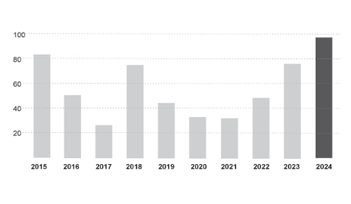 Ryc. 1. Rozpoczęte budowy elektrowni węglowych w Chinaach. Wykres za China Coal Power Biannual Review H2 2024. (zmod.)